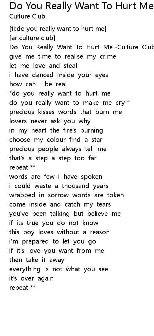 Do you really want to hurt me do you really want to make me cry words are few i have spoken i could waste a thousand years wrapped in sorrow words are token come inside and catch my tears you ve been talking but believe me if it s true you do not know this boy loves without a reason i m prepared to let you go if it s love you want from me then take it away everything is not what you see it s over again do you really want to hurt me. Do you really want to hurt me do you really want to make me cry precious kisses words that burn me lovers never ask you why in my heart the fire s burnin choose my colour find a star precious people always tell me that s a step a step too far do you really want to hurt me do you really want to make me cry do you really want to hurt me do. Lovers never ask you why. Culture club lyrics 78 song lyrics sorted by album including karma chameleon do you really want to hurt me church of the poison mind.