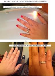 Lots of people stack their wedding and engagement rings and wear both of them on the left hand ring finger. You ve been wearing your engagement every other day and your wedding day doesn t have to be any different. Most brides generally move the engagement ring to their right hand durning the ceremony and then return it to the left. While leaving your engagement ring in your room is a viable option while you re getting married it s only normal to want to show it off as much as possible.